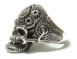 頭部には歯車などの細かいデザインが立体的に彫りこまれ、 下顎にいたるまで、模様が入っています もうすごい精緻さ! 口の部分は隙間があり、歯の1本1本までが細かく再現されています 裏抜きがあるため、リングサイズとしては0.5〜1号程度大きく感じると思います 商品詳細 ■素材:シルバー925 ■サイズ:前面幅約30mm 背面幅約5.5mm :厚さ前面約10mm 最小1.2mm ■重さ:約17.6g
