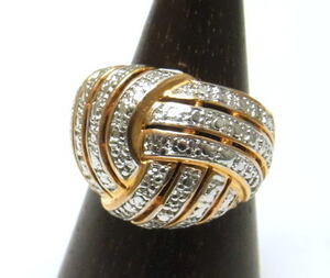 探さないとわかりませんが、実は小さなダイヤモンドが3石入っています。 ランクは低いので白っぽいです。 裏側から見て、小さな光穴が開いている場所に入っています まあほとんどわかりません。 リングのデザインはぷっくりとカーブしていて、丸っこい印象でエレガントです リングサイズは9号ですが、裏抜きがあるため、10号サイズとしております ※ゴールド、ロジウムコーティングがかかっておりますが、これは経年・摩擦などで薄くなり、下地のシルバーが出てきます。 ■サイズ:前面幅約16.5mm 背面2.6mm 前面厚み約6.5mm ■使用石:ダイヤモンド ■重さ:約7g ■素材 :シルバー925/ゴールド、ロジウムコーティング