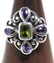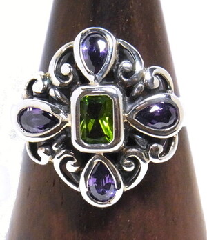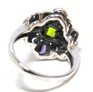 グリーンのスクェアカットの石を中心に、花弁のようにティアドロップカットのパープルの石が埋め込まれています