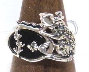 黒いオニキスの水槽に金魚が泳ぎ、横ではネコちゃんが遊びたそうに見つめているデザイン ストーリーを感じるデザインリングです 猫ちゃんの体にはマルカジットがキラキラ輝きます アンティークブランド碌山 ※出来るだけ実物に近いように撮影しておりますが、お使いのブラウザによっても実物と色味が異なることがございます ご了承くださいませ ■サイズ:縦約16.5mm 最小約:2.2mm 厚さ:約4.8mm、厚さ最小:約1.2mm ■素材:silver925 ■使用石:オニキス、マルカジット メーカー希望小売価格はメーカー商品タグに基づいて掲載しています