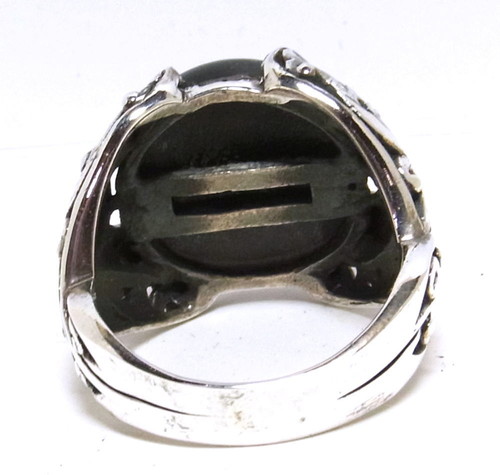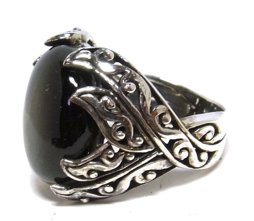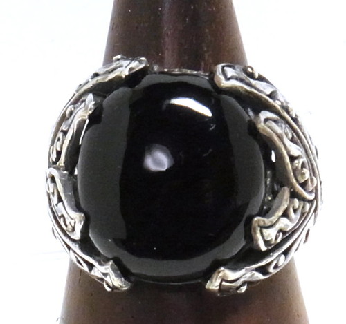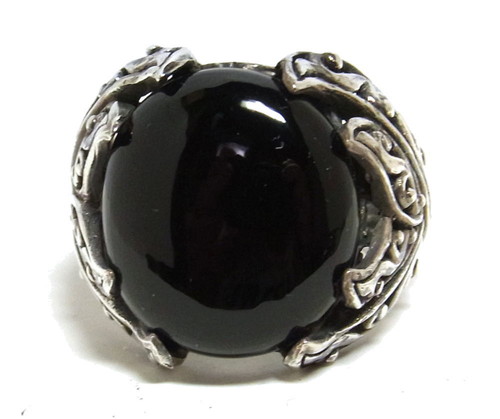 オニキスをメインに使ったリングで、シルバーのデザイン部部が石を掴むような留め方。