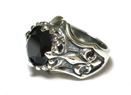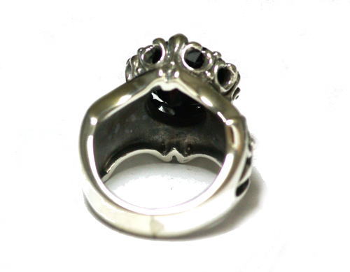 ブラックキュービックを王冠にはめ込んだゴシックなリング。