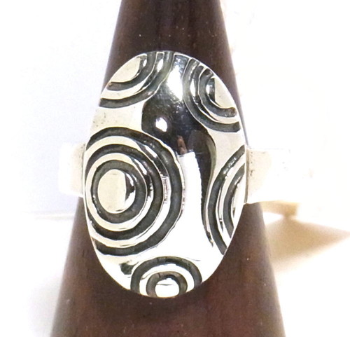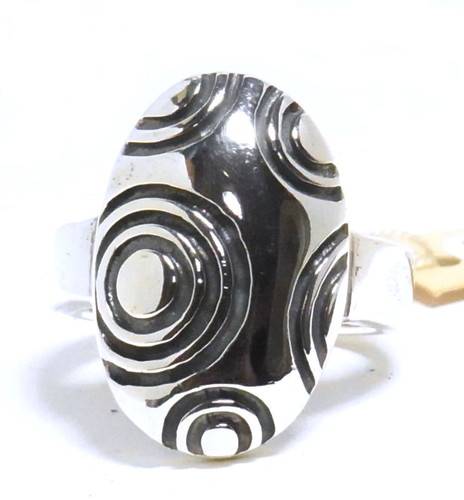 ぷっくりとした楕円型に、大小の円のデザインが並ぶリング