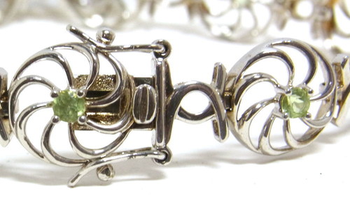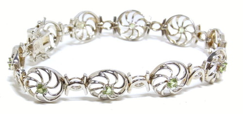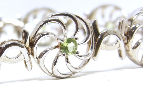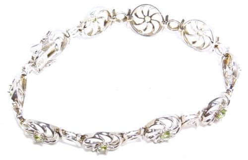 小さなペリドットを埋め込んだ透かしのデザインを連ねたブレスレットです。