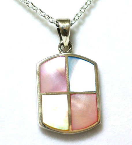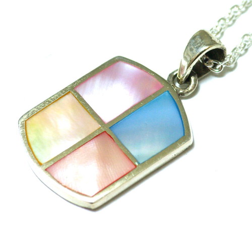 ピンク・ブルー・イエローのシェルをインレイしたドッグタグ型のペンダントで、表面はフラットです