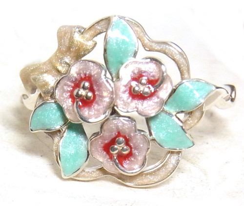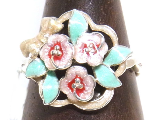 バラの花や葉にはふんだんにエナメルを使ったかわいいリングです。