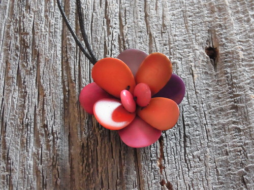 オレンジ、ピンク、赤、紫等色鮮やかな花弁を着けた椿の様な花を表現しています。