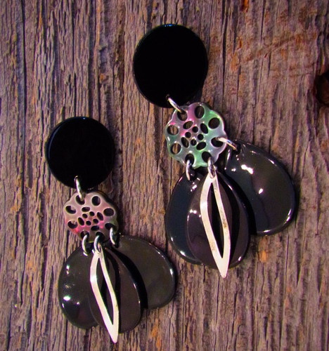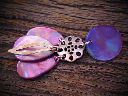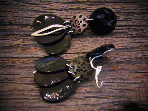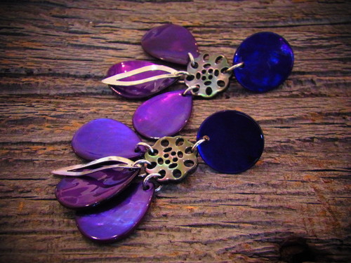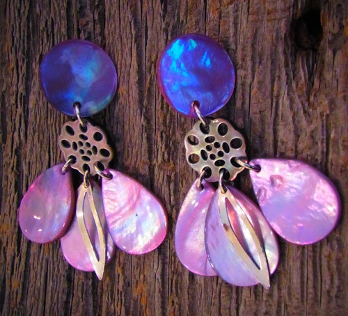 天然素材の貝(白蝶貝)に螺鈿細工を施したハンドメイドのイヤリング。