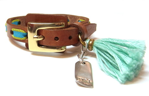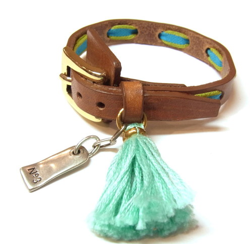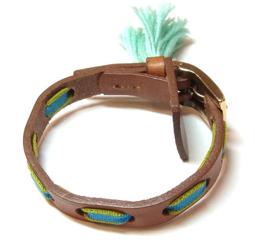 No.3ナチュラルカラーのカーフ革とブルーのシルクタッセルとリボンを編み込んだベルトタイプのブレスレット[No3PUL0039]