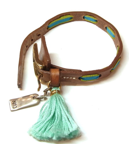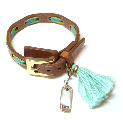 No.3ナチュラルカラーのカーフ革とブルーのシルクタッセルとリボンを編み込んだベルトタイプのブレスレット(No3PUL0039)
