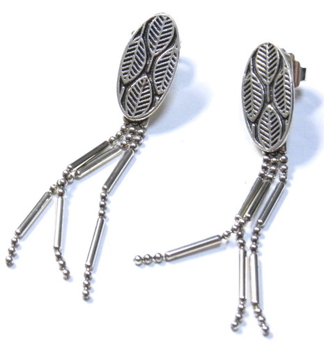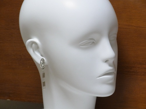 幾何学模様のような、シルバーのデザインから、チェーンが揺れるピアス