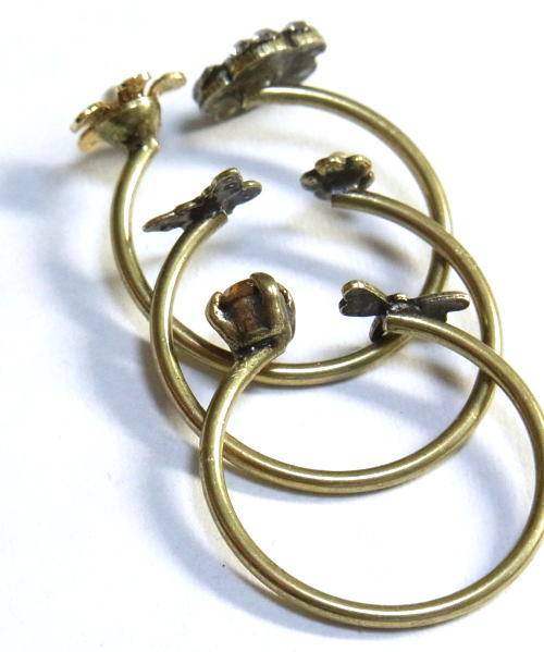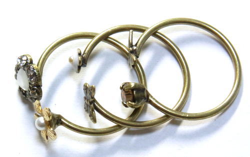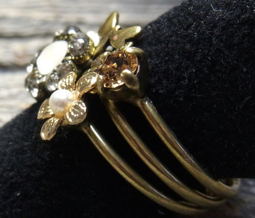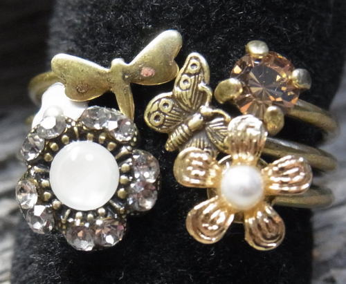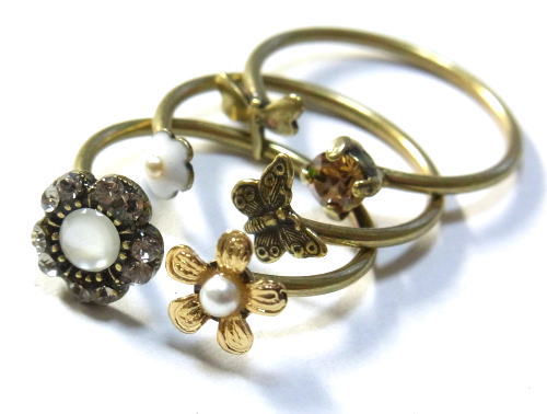 スワロやパールの添えられたお花に、トンボとちょうちょが飛んでいるデザインの3連リング