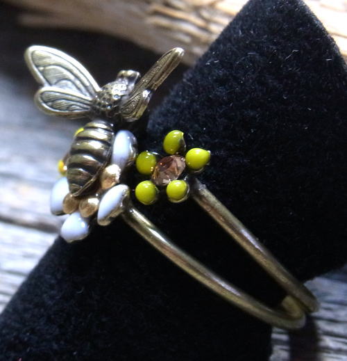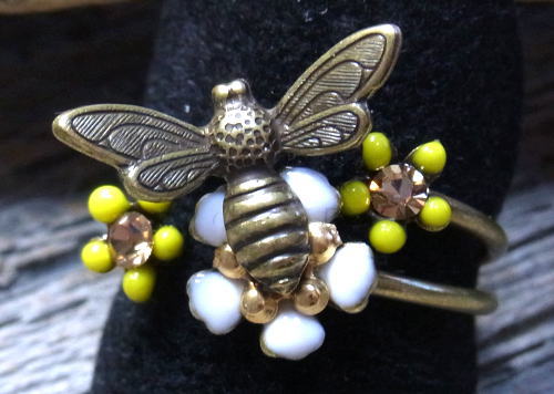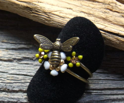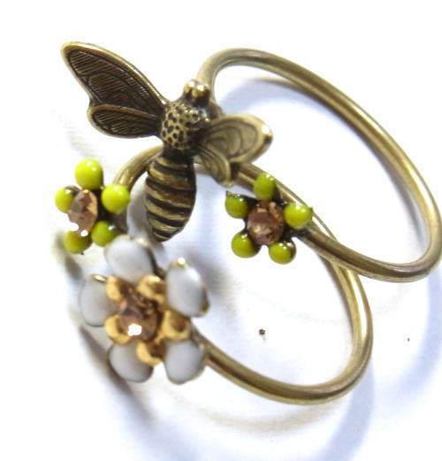 白と黄色のお花に蜂が止まっているデザインの2連リングです