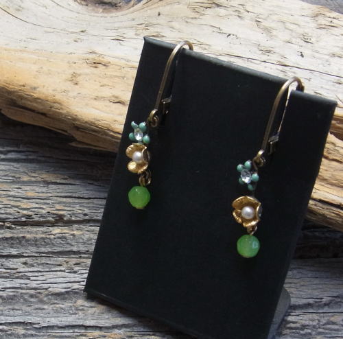 スワロがあしらわれた花、パールがついた花の下に、天然石のカットビーズが揺れるデザインです