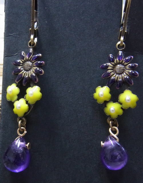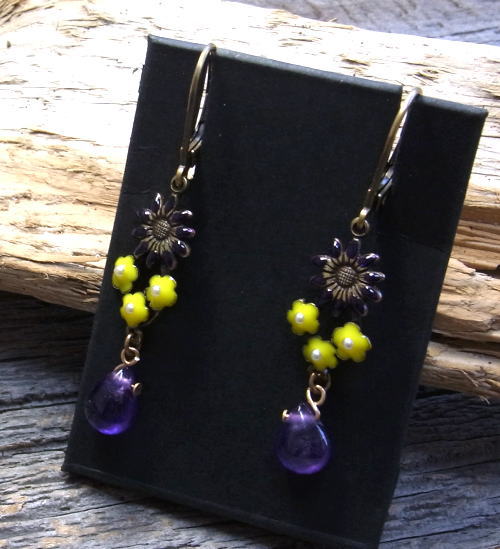 紫と黄色のお花から、アメジストの雫が下がり、雰囲気あるデザインピアスです