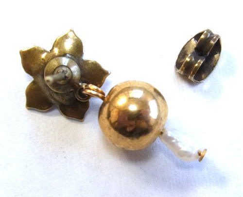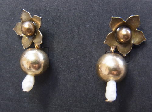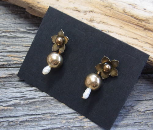 アンティークゴールドのお花の下に、ライスパールが1つ揺れるデザイン・ピアス。