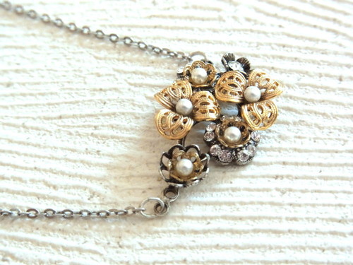 トップには透かしの花びらを施したゴールドの花と、花びらにスワロフスキークリスタルを着けた花