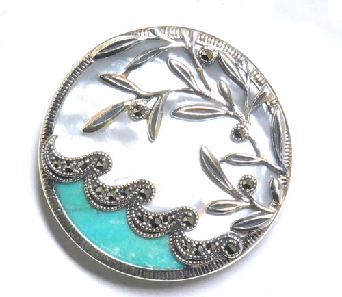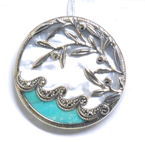 光沢のある白蝶貝と、キラキラ輝くマルカジット、地中海の海のようなターコイズ