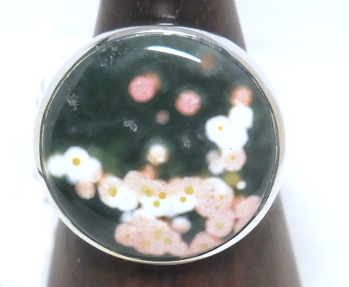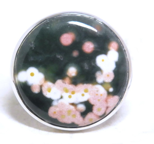 こちらは梅のお花が咲いたような、濃緑にピンクの模様が入ったリングです
