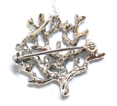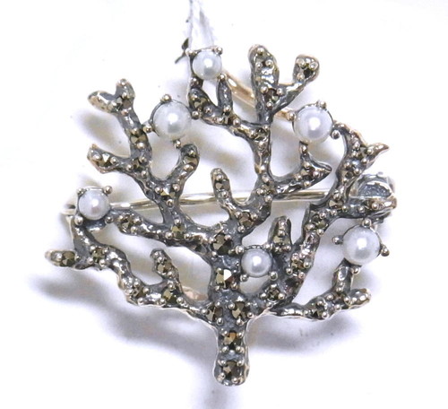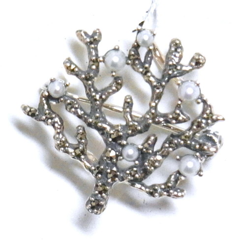ぼこぼことした表面の珊瑚の枝に、シードパールとマルカジットが散りばめられたデザイン
