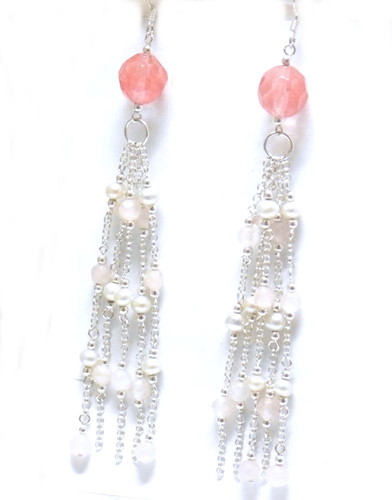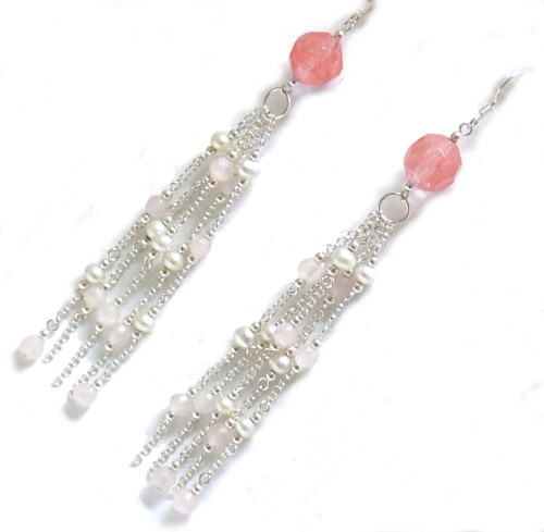 チェリークォーツ、ローズクォーツ、パールを使ったロングピアスです
