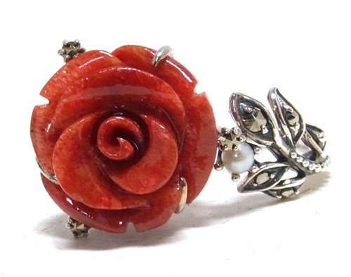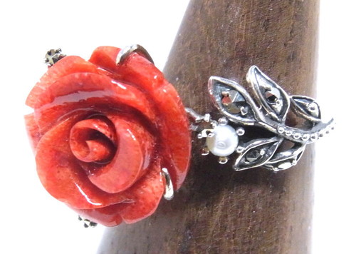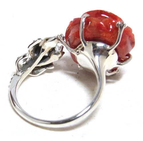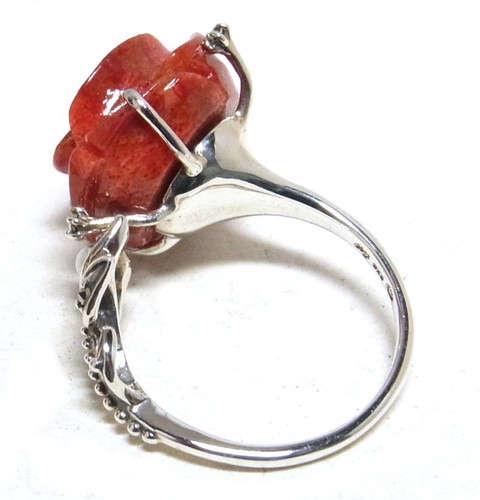 立体的に彫刻された赤いサンゴに繊細な薔薇の葉を合わせたリング