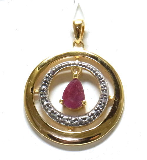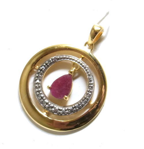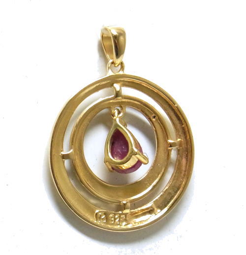 雫型のルビーが中央で揺れる、ゴールドとシルバーのコンビネーションペンダントです