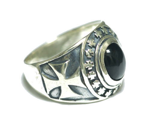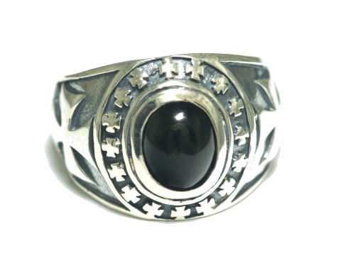 オニキスを中心に、クロスの模様を散りばめた、カレッジデザインのリングです