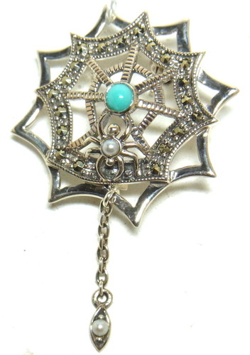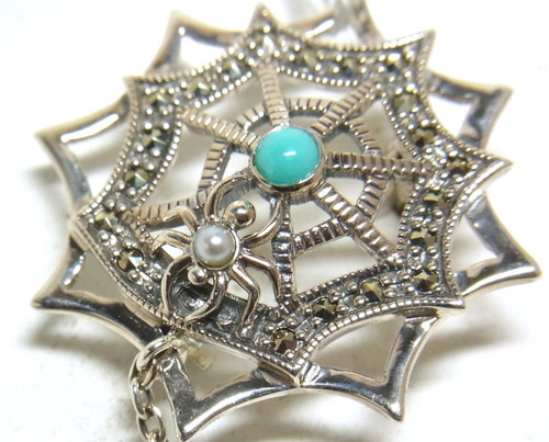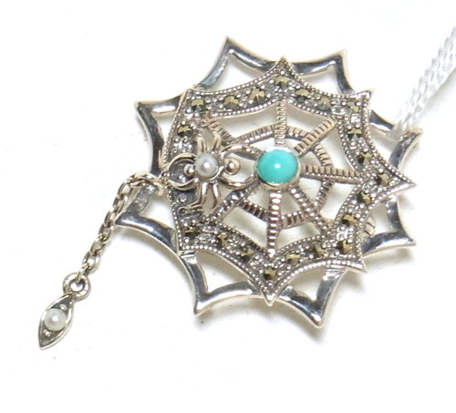 トルコ石(ターコイズ)を中心に広がる蜘蛛の巣にはマルカジットがきらめき、小さなクモさんにはシードパールが1粒!
