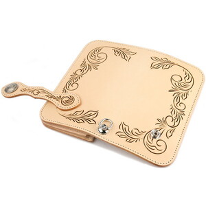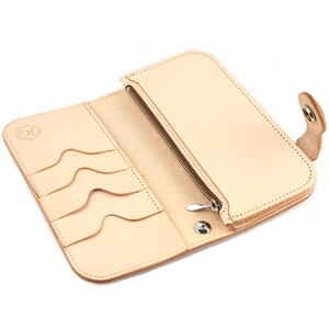 フラップとキーホルダー に米国古銭5セントコンチョを2個使用。 開けた状態の右側に縦にカードケースが4つ。その下に紙幣等が入るポケット。左側に小銭入れ、その上下にも紙幣等が入るポケットを装備しており見た目以上の収納力が魅力です。図柄は革を湿らせ、スイヴェル・ナイフと呼ばれる特殊工具を使い、 フリーハンドで唐草模様をなめらかにカットし描きました。 素材のEU.ダブルバット(牛皮革)とは、ヨーロッパ産の牛原皮のみを使用し、 フランスとの国境に近いベルギー唯一のタンナー(皮革製造業)タナリーマズール社で、 ケブラコ、ミモザ、栗の木からのタンニンを使う伝統製法で鞣した牛皮革です。 きめの細かく、手染めやカービングに適した高級皮革です。 カラーのサドルは図柄を打刻した後、全体にアンティーク染料を塗り拭き取ることにより柄の中に色が残る染色方法で、モカ・ブラックはカービングを施した後、手染めで染色しております。 。 【商品詳細】 ■ステッチ:ミシンステッチ, チェーン:スチール, 本体:EUダブルバット(牛皮革), 金具:米国古銭5セントコンチョ(ニッケル) ■サイズ:close/縦=17.5cm 横=9.5cm open/縦=17.5cm 横=19.5cm チェーン/48cm ■注意:画面上と実物では多少色具合が異なって見える場合もございます。ご了承ください。