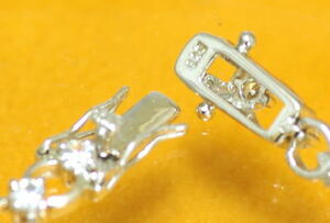 キラキラと、まるでダイヤのような輝きです。 ぐるりと一周に渡って石が留めてあるので、回っても気にしなくていいです(^○^) 女性らしい丸みのあるラインが、石と石をつなぎます。 白いシャツの袖からチラリ・・・エレガントです。 変色防止のロジウムコーティング済み! ※着用時、全長18cmです。 一コマ約6mmですので、コマ詰めご依頼の方は「○コマつめ」とお申し出ください。 コーティング作業の都合で、納期2週間ほど頂きます。 料金は無料です。
