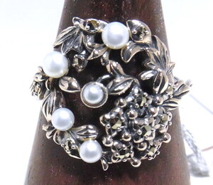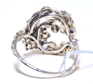 お花やつぼみを連ねてリースのように丸い形にして仕上げたとても繊細で可愛らしいリング ふんわりと立体的な葉に透かし模様をいれてとても軽やか、柔らかい雰囲気をお楽しみいただけます。 ※お使いのブラウザによっても実物と色味が異なることがございます。 ご了承ください アンティークブランド碌山 ■[サイズ]リング幅:最大前面 約20mm リング腕最小:約1.5mm ■素材:silver925 ■使用石:パール、マルカジット