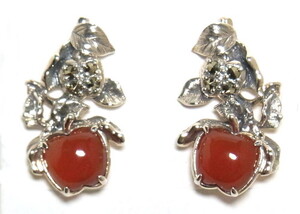 こっくりと深みのある赤がうつくしい赤メノウと、煌めくマルカジットで表現いたしました。 立体的で繊細にテクスチャーの入れらた葉の中に2個のリンゴをあしらった上品なピアスです ギリシャ神話で神々に食されていたと言われる黄金のリンゴ。 古来よりリンゴは若さのシンボルと言われています。また、ヨーロッパでも「愛」「豊穣」「若さ」などの象徴とされ、丸い形は「永遠」を表しているとされるなど、ラッキーモチーフとして人気です。 ※カーネリアンは天然石のため、個々で色味が異なります。画像は現物です ※お使いのブラウザによっても実物と色味が異なることがございます。 ご了承ください アンティークブランド碌山 ■[サイズ]最大 縦約20mm×横約10mm ■素材:silver925 ■使用石:カーネリアン、マルカジット