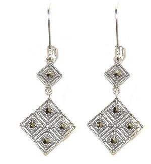 四角いデザインを細かく連ねたようなデザインで、四角の中央にはマルカジットが輝きます ※ピアス金具はレバーバックタイプで、イヤリングより長い(モチーフの上に金具があるため)です。 アンティークブランド碌山 ※出来るだけ実物に近いように撮影しておりますが、お使いのブラウザによっても実物と色味が異なることがございます ご了承くださいませ ■サイズ :ピアス 縦約38.5mm(フック除き 約23mm) 横:約14m ■素材:silver925