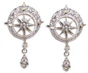 コンパスモチーフのイヤリングに、小さなしずく型パーツが揺れるデザイン。 進むべき道を示すコンパスがエレガントに輝き、揺れるしずくが華やかさを添えます。 センターには星や花が飾られ、周囲の唐草模様と貝殻でクラシカルな仕上げが魅力 アンティークブランド碌山 ※出来るだけ実物に近いように撮影しておりますが、お使いのブラウザによっても実物と色味が異なることがございます ご了承くださいませ ■サイズ :約30×18mm ■素材:silver925(イヤリング金具はメッキ製)